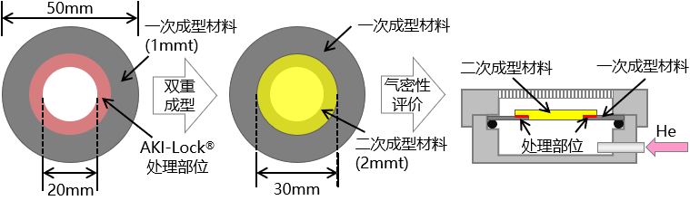 如下图所示,我们用AKI-Lock® 制作了二次成型品,并在施加热冲击的前后使用氦气(He)进行了气密性试验。